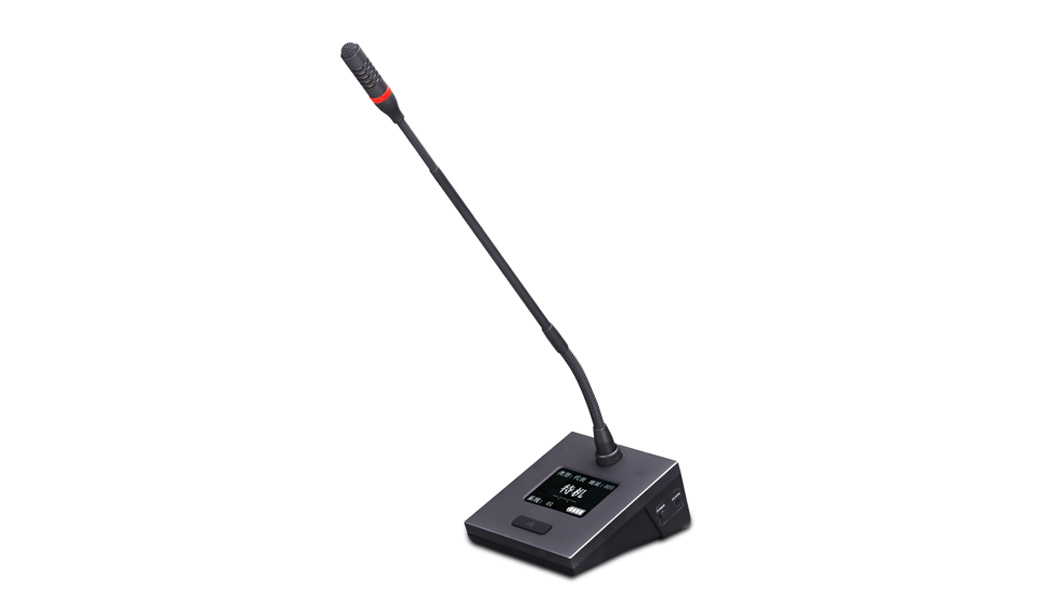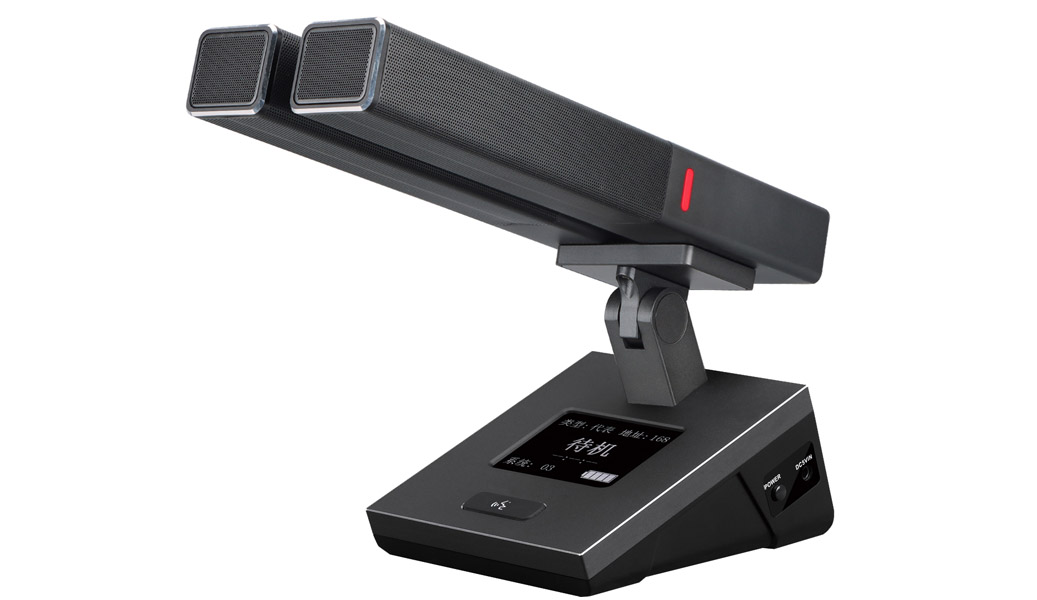 2、采用方型外观话筒杆,纵向可调节角度为80度,话筒杆左侧、右侧和上侧设计了发言指示灯。